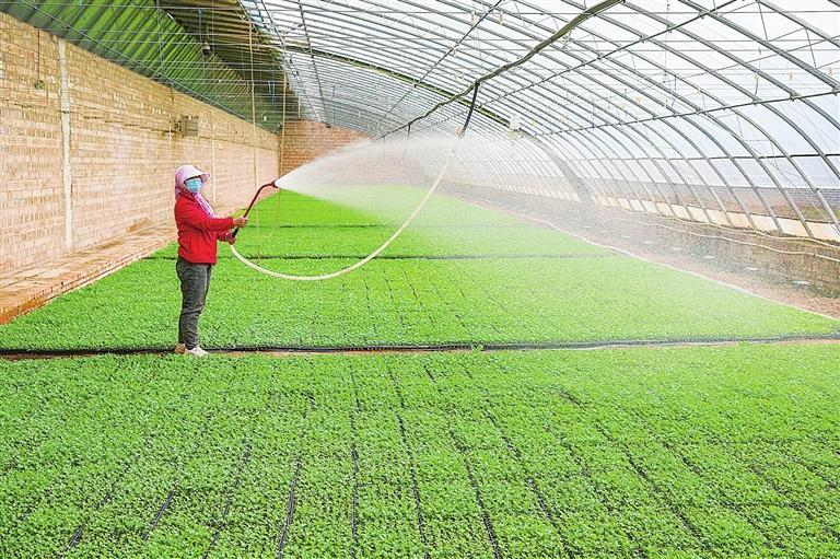 在崆峒区白水镇打虎村宜惠源育苗基地,工人给蔬菜幼苗浇水。 姚志强
