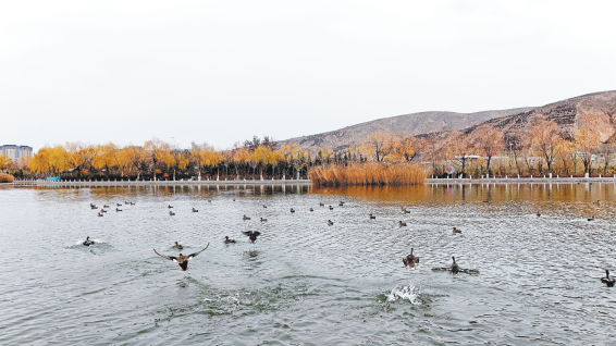 11月17日,记者在定西人工湖看到,澄澈湖面轻波微动,成群水鸭或悠然游弋,或振翅扑水,溅起细碎涟漪,为冬日添了几分灵动生气。