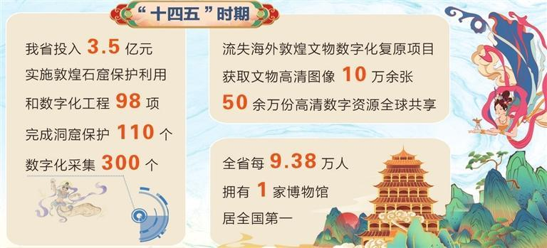 在文物保护提质升级方面,我省投入3.5亿元,实施敦煌石窟保护利用和数字化工程98项,完成洞窟保护110个、数字化采集300个,建成全球首个文物保护多场耦合实验室,制定国家和行业标准27项,科研成果服务16省市及部分共建“一带一路”国家;流失海外敦煌文物数字化复原项目获取文物高清图像10万余张,50余万份高清数字资源全球共享;第四次全国文物普查新发现线索4659条,投入24.26亿元实施900余项重要文保项目;打造河西走廊国家遗产线路,创建嘉峪关长城国家文物保护利用示范区,全省文物系统性保护成效显著,“中国特色·敦煌经验”国际影响力持续提升。