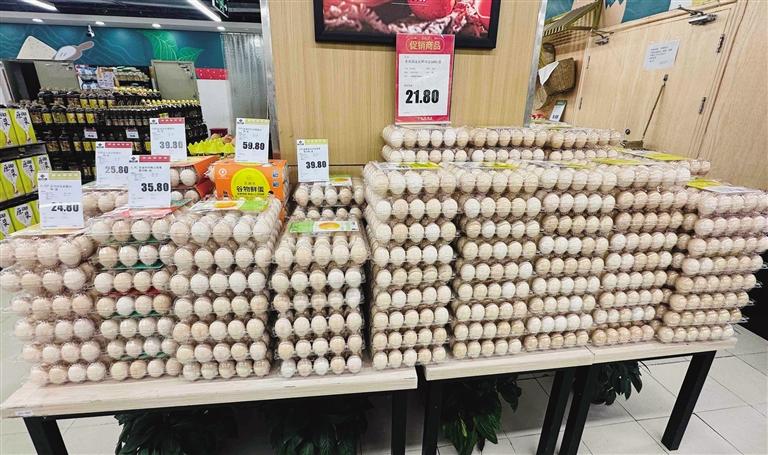 随后,记者在市内多家商超看到,鸡蛋品类丰富,玉米蛋、叶黄素蛋、五谷蛋等琳琅满目。北京华联超市内,散装鸡蛋标价3.68元/斤,盒装鸡蛋按品种和数量定价21.8元至59.8元不等,部分产品还推出“买15枚叶黄素蛋赠半斤土鸡蛋”的优惠活动。