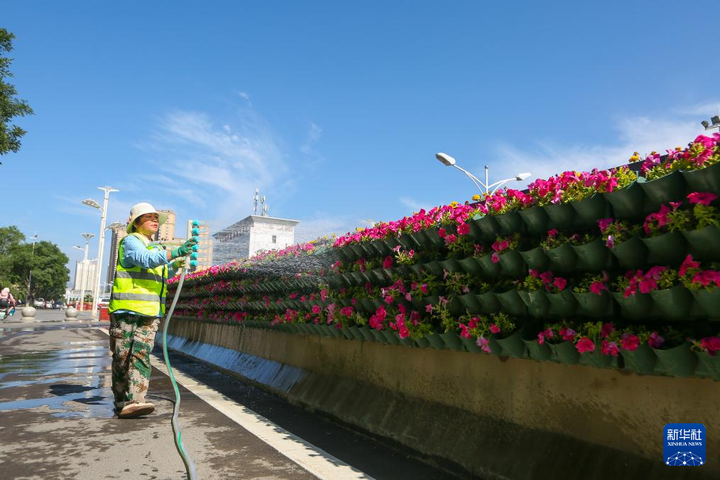 2025年6月5日,工作人员在平凉市一街道路边养护花卉苗木。新华社发(吴希会摄)