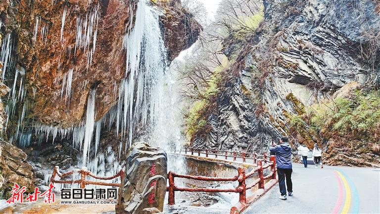 国家5A级景区官鹅沟冰瀑吸引游客赏景拍照。新甘肃·甘肃日报通讯员 刘国庆