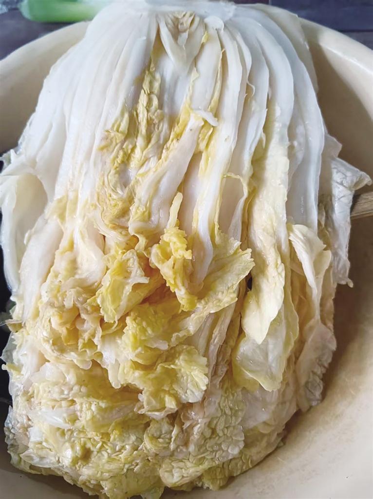 除了辣酱,兰州人的厨房里还有其他的过冬必备——各种腌菜,也在筹备着。在兰州七里河区马滩银滩花园,居民王慧兰家的小院里,正在热闹地腌酸菜和花花菜。“这腌酸菜啊,可是咱兰州人过冬的必备。”王慧兰一边说着,一边将刚从市场买回来的新鲜大白菜一颗颗摆放整齐。这些大白菜颗颗饱满,叶片翠绿,是腌制酸菜的上好选择。王慧兰先将大白菜外面的老叶去掉,然后把白菜一切两半,放在大盆里用清水仔细地冲洗干净。洗好的白菜需要放在通风的地方晾干水分,她把白菜整齐地码放在阳台上,时不时翻动一下,确保每一片叶子都能晾干。