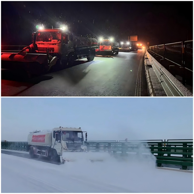 环兰运营分公司及时启动除雪保畅应急预案,管理人员靠前指挥、全程调度,利用监控分中心“中枢”作用,第一时间发布雪情预警信息,科学调度除雪力量,实时掌握车流及各作业组作业动态。养护部迅速集结除雪保通队伍,3辆道路巡检车先行开展全路段巡查,5台除雪滚刷车、1台推雪板车、1台暴风除雪车随即沿夏官营东至忠和路段有序推进除雪作业,同步撒布融雪剂6吨,有效抑制路面结冰。