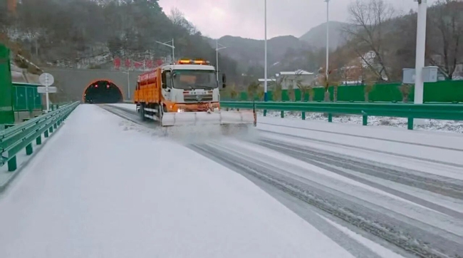 康略高速地处秦巴山区,桥隧比高达74%,沿线山势连绵、弯道众多,冬季桥面、陡坡等区域易出现积雪结冰。为提升除雪效率,各部门分工协作、攻坚克难,养护单位调配4台专业除雪设备,采取“机械为主、人工为辅”的作业方式,对管养路段实施梯队式除雪;同步设置警示标识,加强交通引导,确保车辆有序通行。巡检队伍加大巡查频次,对桥隧衔接段、临水临崖路段等重点区域实施全覆盖排查,构建起“除雪、疏导、管控”三位一体的保畅格局。