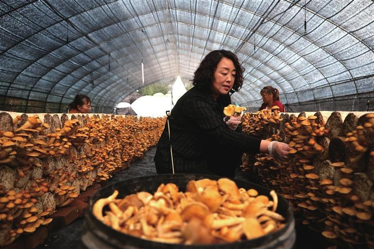 康县碾坝镇安家坝村景盛种植农民专业合作社社员们在种植基地采收滑子菇。陇南日报记者 黄培军 摄