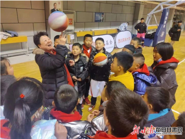 王小玲与姚基金希望小学篮球季支教项目学校小学生互动。