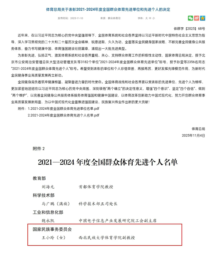 新甘肃客户端11月27日讯(新甘肃客户端记者 李杨 李萍)近日,国家体育总局发布《关于表彰2021-2024年度全国群众体育先进单位和先进个人的决定》,西北民族大学体育学院王小玲副教授获评“2021-2024年度全国群众体育先进个人”荣誉称号,这是该校首次在群众体育领域取得的国家级个人荣誉。据了解,该项评选表彰是由人力资源和社会保障部、国家体育总局联合授予的体育系统最高规格表彰,每四年评选一次。