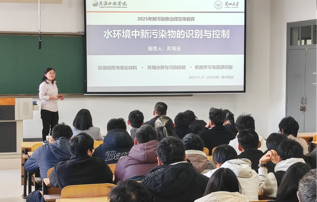 当天下午,主题讲座同步开讲,为现场观众带来专业知识盛宴。甘肃省固体废物与化学品中心专家、兰州大学资源环境学院郑易安教授先后登台,结合甘肃省新污染物治理现状,深入解读了《新污染物治理行动方案》等政策法规,详细讲解了新污染物监测、源头削减、末端治理等核心技术与实践路径。专家们用通俗的语言拆解专业知识,结合典型案例分析治理难点与解决思路,让在场师生对新污染物治理的政策要求与技术方法有了更全面、深入的认识。
