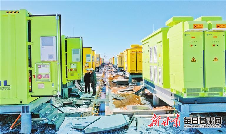 近日,在临泽县北部滩新能源产业园内,工作人员对储能电池集装仓项目输送电设备进行调试和检测。新甘肃·甘肃日报通讯员 王 将
