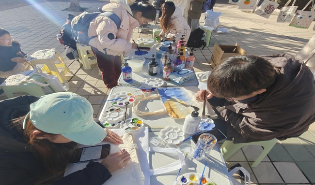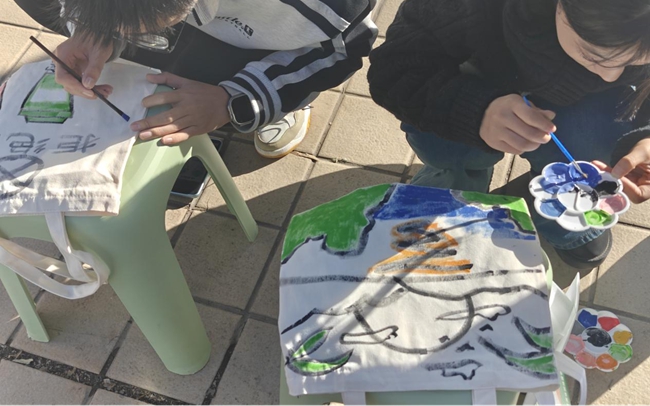 活动前期,主办方精心筹备了250个空白帆布袋、环保颜料、画笔等创作材料,确保每位参与者都能充分发挥创意。下午2时,活动正式开始,同学们有序领取创作材料后,迅速投入创作。有的席地而坐,认真构思构图;有的相互交流,分享创作灵感;负责现场指导的志愿者则不时为大家提供调色、勾线等技巧建议,整个视野广场俨然成为一片创意的海洋。
