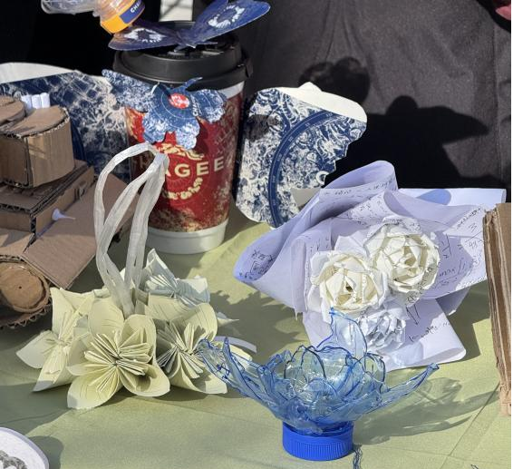 在花艺作品展示区,霸王茶姬奶茶杯包装纸折制的蝴蝶与花朵栩栩如生,微风拂过仿佛翩然起舞,晕染出低碳美学的独特韵味,“平时喝奶茶总会剩下不少包装纸,丢了很可惜,就试着做成花艺作品,既美观又环保。”资源环境学院的杨同学一边展示自己的作品,一边分享创作思路。此外,现场还展示了数十件折纸作品,枫叶、百合花等造型精致,纸张多来自废旧笔记本、宣传单页,经过同学们的折叠、塑形,焕发新的生机,不少同学驻足观赏,并不时与创作者交流制作技巧。