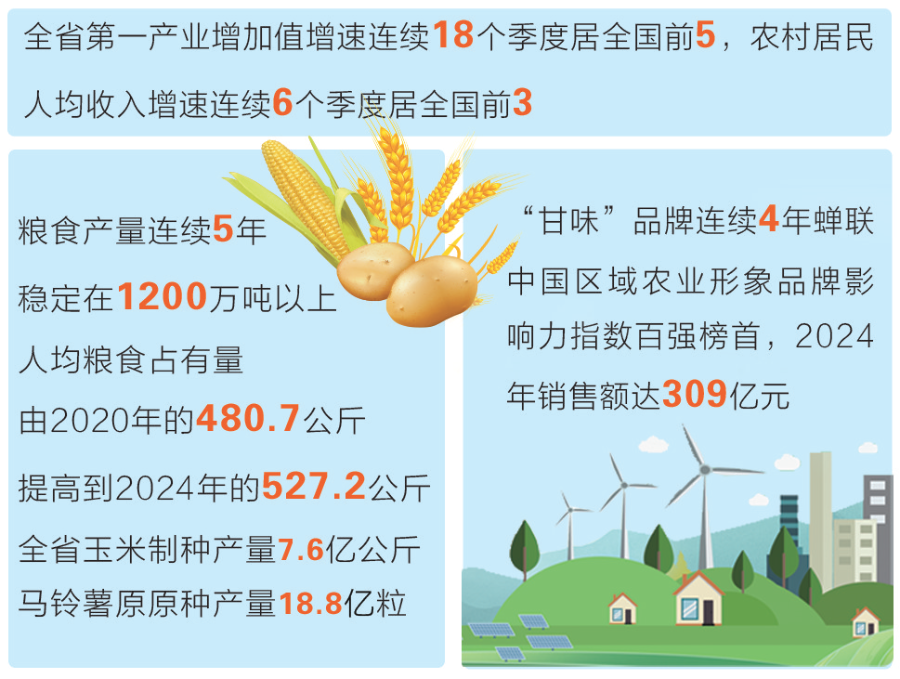 产业发展由“扩规模”向“提质效”集聚提升。深度挖掘寒旱特质,启动建设全国现代寒旱特色农业先行基地,开展“扩量、提质、延链、增效”四大行动,全力打造“牛羊菜果薯药粮种”八大产业集群和25个产业带。实施“引大引强引头部”行动,新增转规农产品加工企业214家,农产品加工转化率提升至65%。“甘味”品牌连续4年蝉联中国区域农业形象品牌影响力指数百强榜首,设立“甘味”全国授权门店100个,2024年销售额达309亿元,农产品出口37亿元。