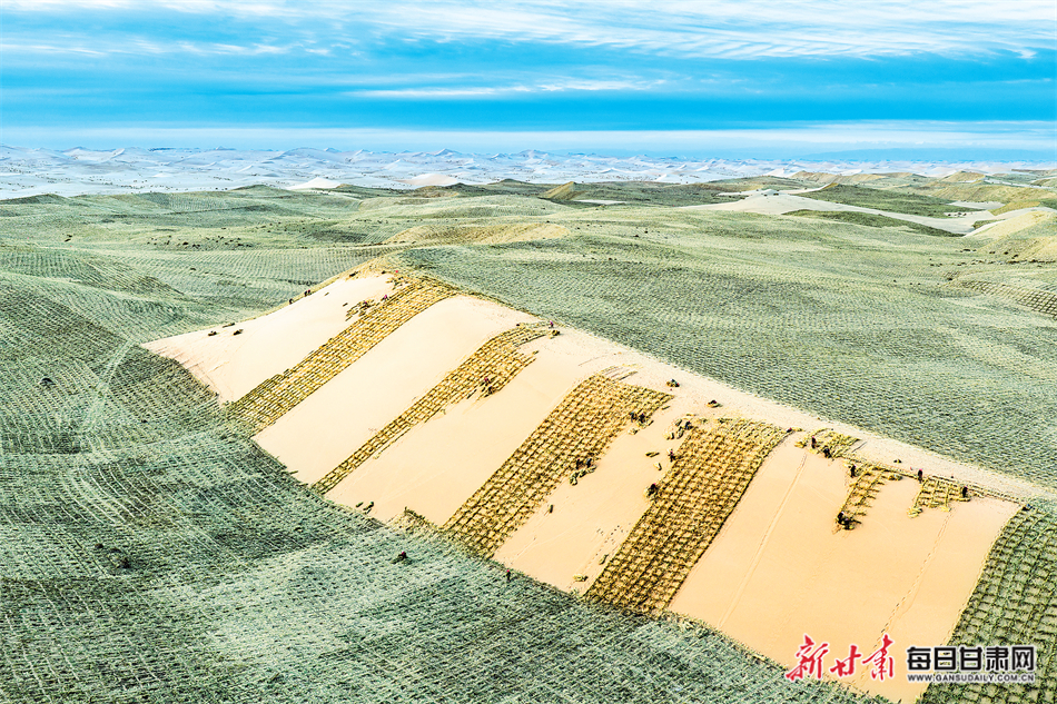 近日,治沙工人正在民勤县腾格里沙漠压沙,草方格沙障如棋盘般整齐排列、不断延伸。新甘肃·甘肃日报通讯员 刘怀裕