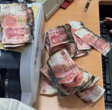 10月23日,一位神情焦虑的年轻客户走进招商银行兰州分行营业部,欲办理存现业务却面露难色,他向柜员武家榕说明所持现金“有些特殊”。当客户小心翼翼拿出一摞用塑料袋包裹的5000元残损人民币,这些现金已被大火灼烧,纸张碳化酥脆、堆叠粘连,稍一触碰便可能碎裂,在场人员瞬间明白了“特殊”的含义。