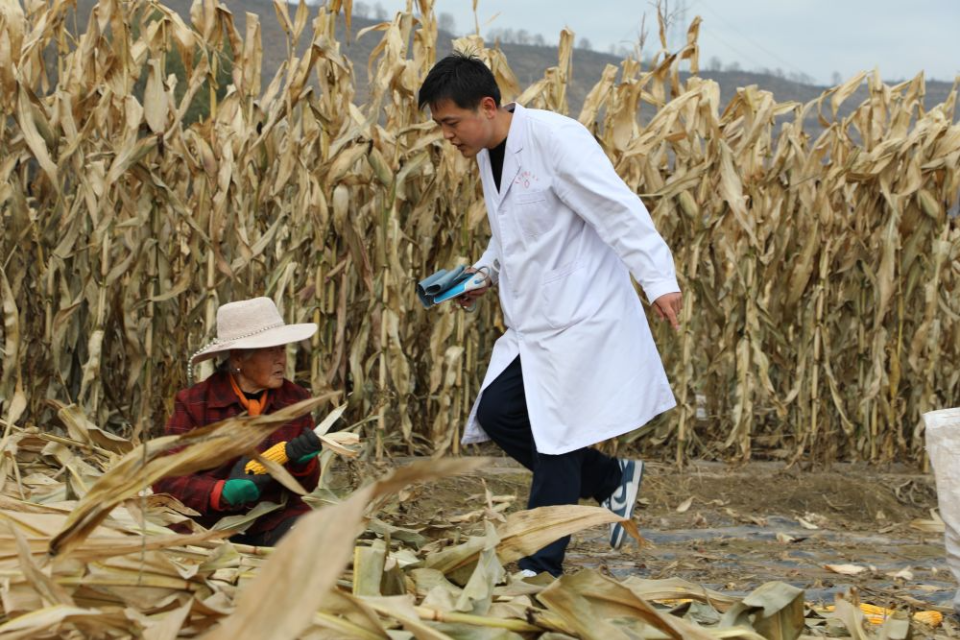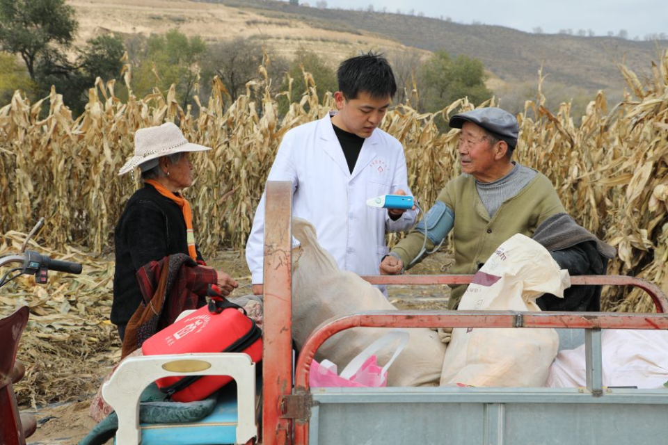 冬日照耀下,一对农家夫妻席地坐在田地里掰玉米。正在走村入户的王鑫,跨步跃上田埂,缓缓走上前,打开行医箱,就地给老乡测量血压。