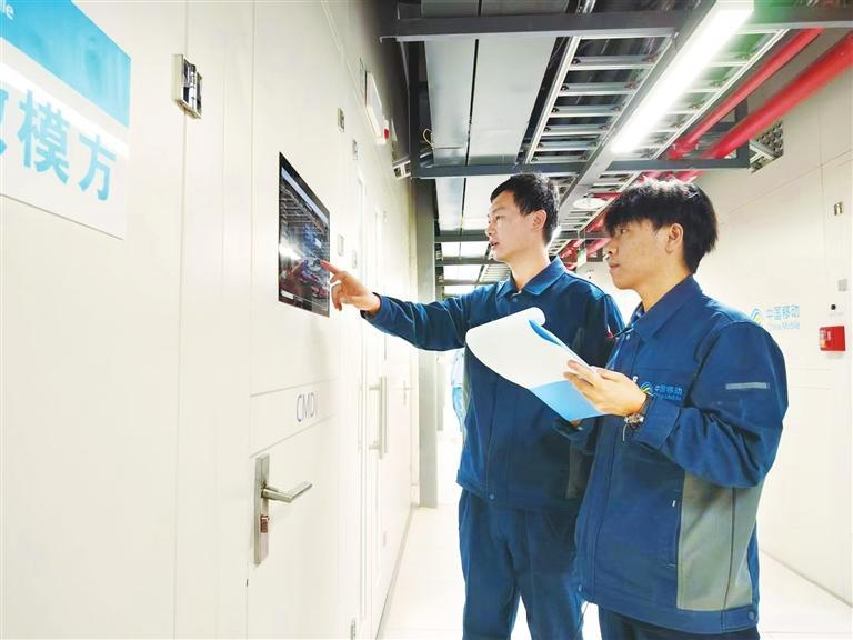 中国移动(甘肃·庆阳)数据中心工作人员查看设备运行情况。