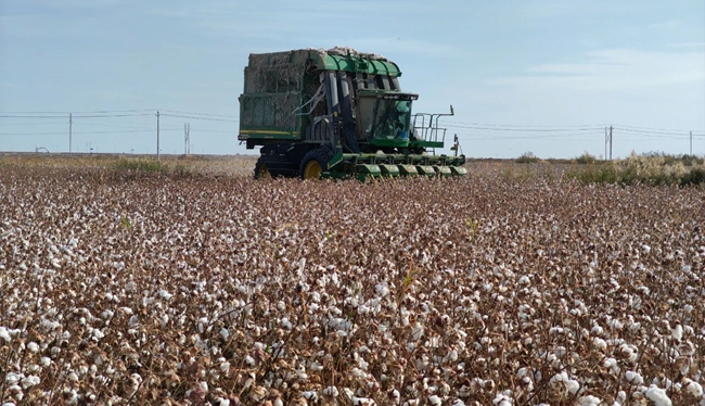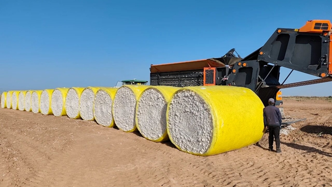 近日,亚盛金塔分公司的盐碱滩,被一片丰收的“银海”所覆盖,采棉机在田间高效作业,机器后方吐出硕大、紧实的棉花包,整齐排列在地里。