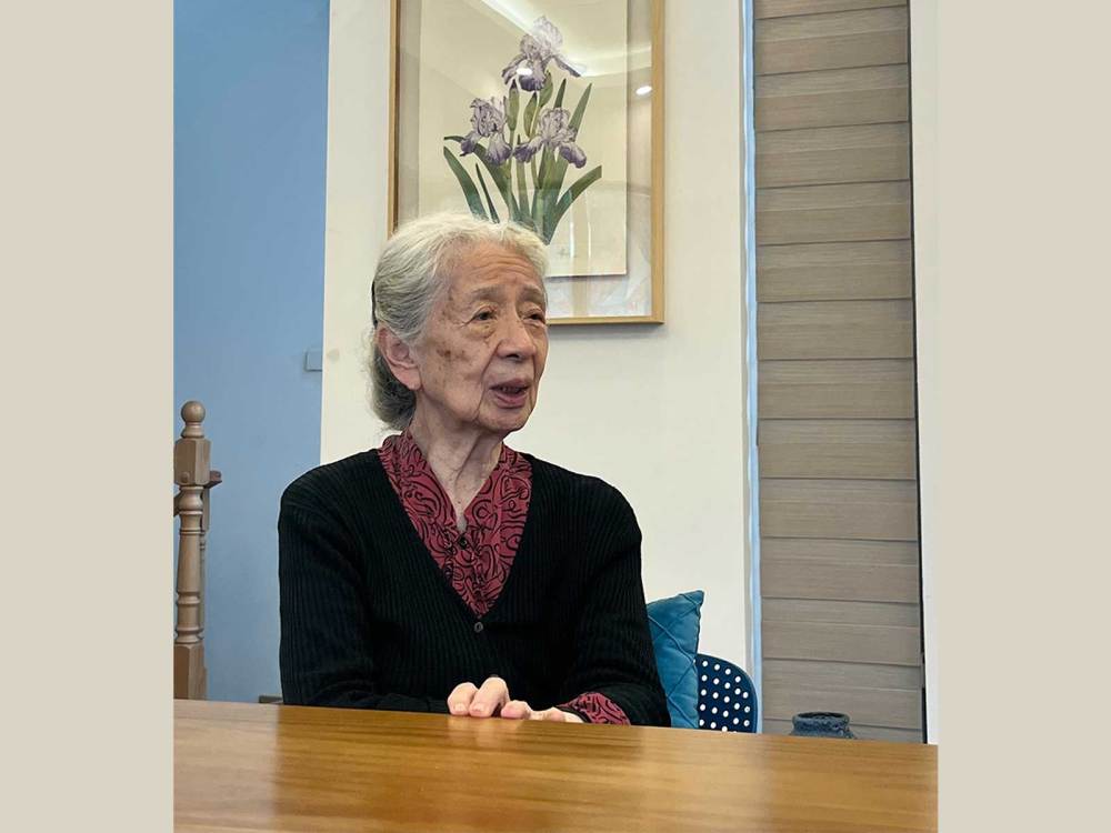 常沙娜坐在她的花卉写生作品前(资料照片)。新华社记者 张玉洁 摄