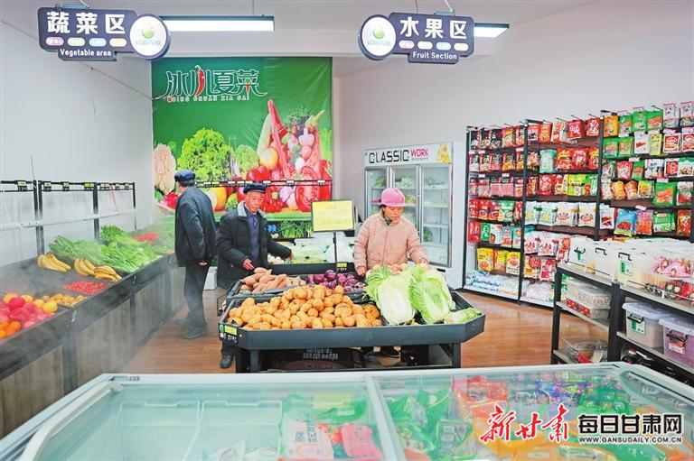 胡林家乡朝阳社区安置点,群众在社区超市采购新鲜的蔬菜和水果。