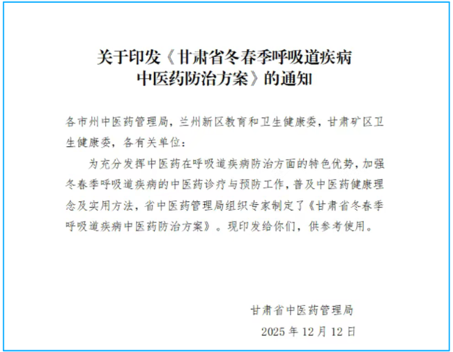 面对H3N2流感的流行,无需过度恐慌,遵循“预防为先、对症治疗、科学养护”的原则,就能有效降低感染风险、减轻病情影响。甘肃省印发的《冬春季呼吸道疾病中医药防治方案》提供了全周期的中医防护指南,而连花清瘟等对症药物则为流感治疗提供了可靠选择。在流感高发季,做好个人防护、掌握科学应对方法,用中医智慧守护全家健康,即可平稳度过冬春季呼吸道疾病流行期。(任雨萌)