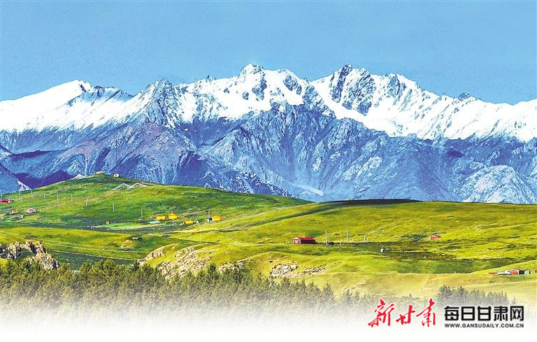 肃南县境内祁连山雪山巍峨耸立,白云飘飘碧空如洗、广袤翠绿的草原铺展至天际。新甘肃·甘肃日报通讯员 王 将
