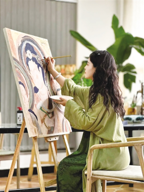 一块画板、一支画笔、一个调色盘,每逢周末,酒泉市东关街第一小学的美术老师徐丽君都会准时来到朋友的画室,在静谧的时光中,与敦煌壁画展开一场跨越千年的对话。画笔起落间,水月观音的面部轮廓渐渐清晰,发髻纹路细腻流畅,头饰珠光若隐若现。她沉浸在笔墨丹青里,任时光悄然流淌,对敦煌艺术的热爱愈发深厚。