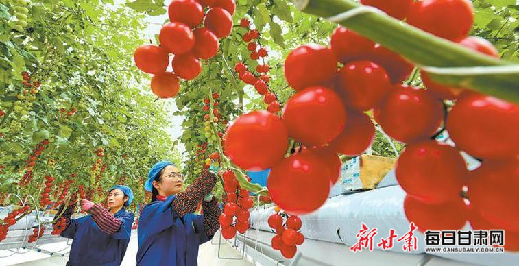 民乐县春禾智慧农业工厂智能温室内,樱桃番茄进入采摘期(资料图)。新甘肃·甘肃日报通讯员 王将
