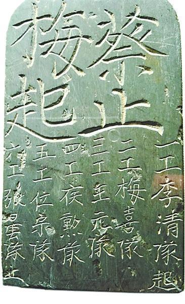 那么,这一段工程具体是怎么施工的呢?在它背面的文字有详细的说明,上半部刻有四个大字:“蔡止梅起”,根据《肃镇华夷志》记载:“蔡”指凉州卫指挥蔡纪,“梅”指肃州卫指挥梅景。“蔡止梅起”刻于工牌背面上部,且为四个大字,足以说明蔡纪和梅景的显著地位和所承担的重要责任。下半部刻有六行小字,分别是:“一工李清队起,二工梅喜队,三工王元队,四工侯勋队、五工位宗队,六工张昙队止。”从工牌的内容可以看出,当年修筑长城时,采用分段逐级承包方式。从工牌出土的地段到肃州西长城北端大约一公里,由此可以推断,第一大工段分为六个小工段,由六个施工队,在10天的时间内完成。这种由大到小的多层管理施工方式,分工明确,责任到人,确保了修筑长城的工程进度。工牌是一个责任牌,为跟踪工程质量之用,并为以后追查责任确定依据。可见,明代修筑长城,对质量要求是非常严格的。