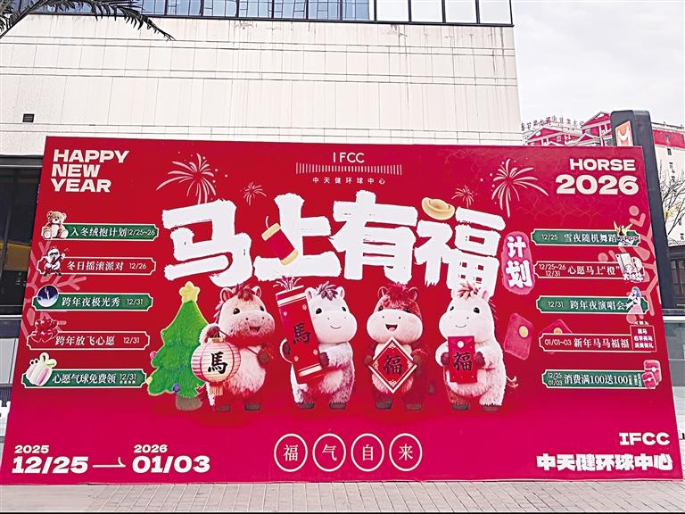 除了热闹的活动之外,各大商圈的消费优惠也诚意满满,从餐饮团购到零售满减,让市民在享受乐趣的同时,花钱更划算、消费更尽兴。IFCC中天健环球中心自12月25日至1月3日推出“新年马马福福”活动,名字含“马”或属马的顾客进店消费可享专属福利;同时推出“消费满100元送100元代金券”活动,代金券可在2026年1月4日至31日使用,把优惠延续到新的一年。国芳中心推出“1元团888元大礼包”,内含“马上有钱”小马挂件、代金券及礼金,花小钱即可解锁多重惊喜。