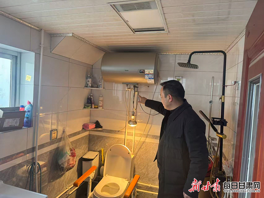 岷县残疾人康复中心创办人高万炜向采访团介绍王琴平家卫生间无障碍设施