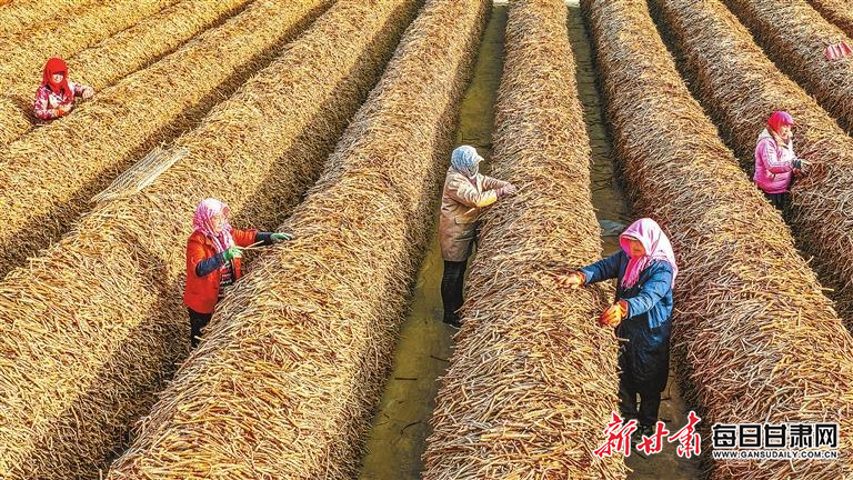 近日,永靖县三塬镇刘家峡农业开发集团中药材加工基地,工人正在分拣、码放黄芪。新甘肃·甘肃日报记者 田蹊