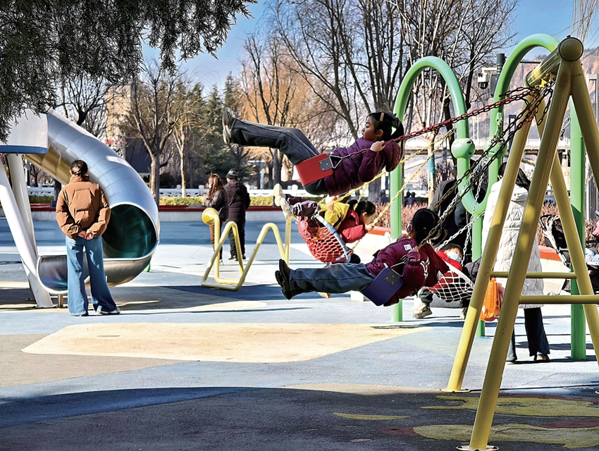12月27日,孩子们在位于新河湾对面的河兴园口袋公园荡秋千。近日天气晴朗,市民纷纷走出家门,用户外运动的形式迎接新年的到来。