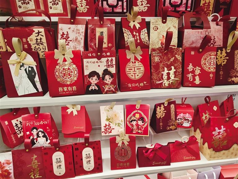 这波热潮的主力,是计划在双节期间完成婚嫁的新人家庭。在所有商品中,什么是必须购买的?哈玉梅肯定地说:“喜糖盒和喜字,销量最大,是婚礼的‘灵魂’。”她觉得,喜糖盒是每场婚礼的绝对标配;而喜字则承载着更深的文化情感,“哪怕布置再简单,喜字必须贴,少了它,喜庆的味儿就淡了。”其他装饰用品则依新人喜好和预算而定,灵活度较高。