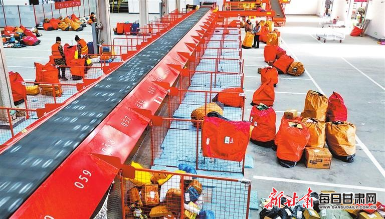 张掖丹霞公路港物流园的工作人员在分拣快递。新甘肃·甘肃日报通讯员 王将