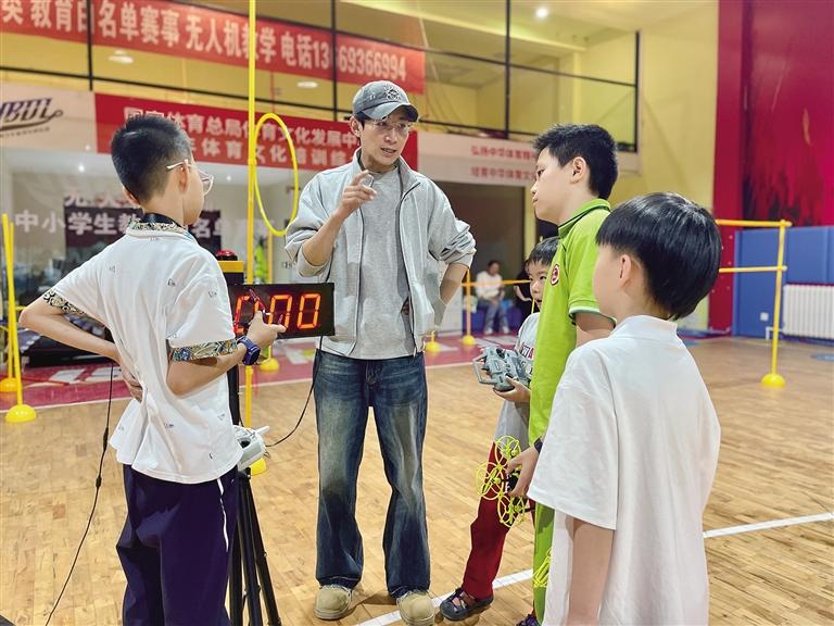 灵巧的无人机穿梭于黄色障碍间,孩子们紧握遥控器,小脸写满专注。一位瘦高的教练穿梭其间,不时俯身指导……在训练场上,周鹏宇正带领着他的“小飞手”们探索蓝天的奥秘。