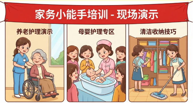 想要自己动手提升居家幸福感?现场将开设“微课堂”。专业讲师将通过现场演示与手把手教学,向居民传授养老护理、母婴护理、清洁收纳这三大核心家政技能。这不仅提升了家庭自我服务能力,也推广了专业的家政服务标准。