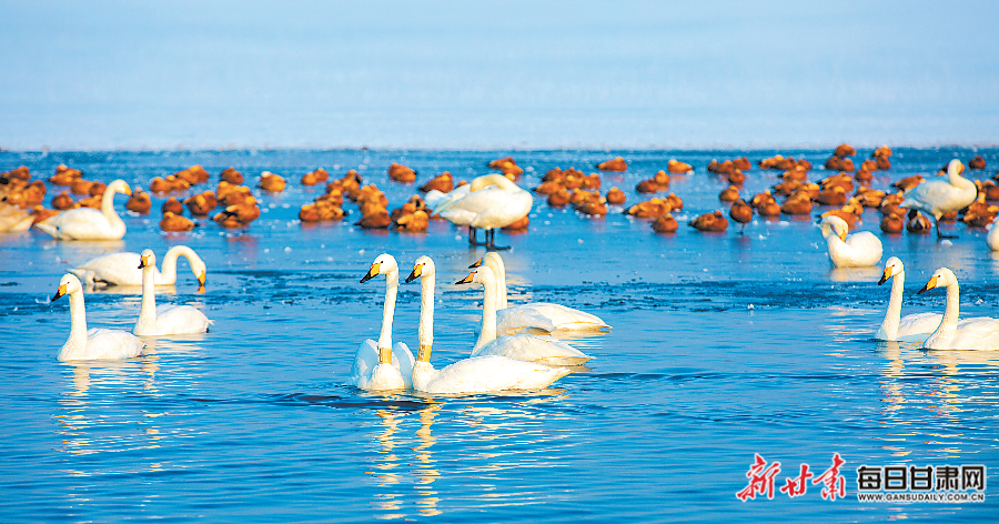 近日,张掖黑河湿地国家级自然保护区,越冬的大天鹅在河水中游弋、觅食。新甘肃·甘肃日报通讯员 杨永伟