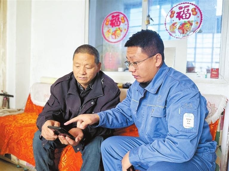 双泉供水部水管员指导村民通过微信小程序查看用水情况。