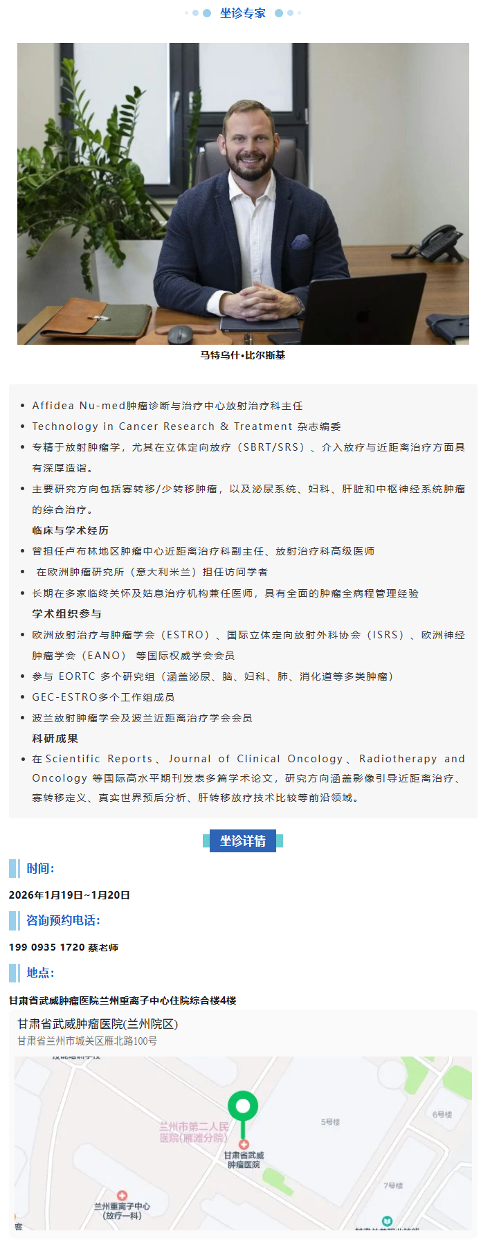 1月19日-20日期间,马特乌什·比尔斯基教授将开展特需门诊服务,为患者提供国际水准的个性化诊疗方案,让患者足不出境享欧洲顶尖肿瘤放疗专家的精准诊疗。