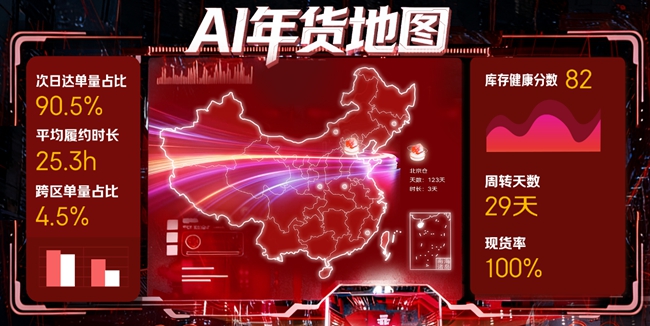 最令商家省心的是,“AI年货地图”可大幅降低春节前的补货难度。以往商家需同时向多地仓库铺货,如今只需将商品集中发往最近的仓库。例如,某上海宠粮商家将商品发到上海仓,系统即智能分配至北京、沈阳、武汉和西安等地,实现“一次发货、全国覆盖”,实现跨区发货比例低于1%,让商家专注经营、轻松备战年货季。