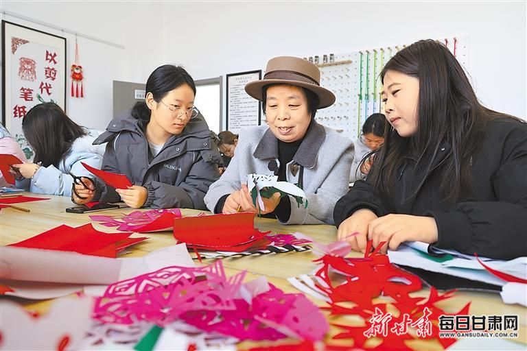 近日,庆阳剪纸非遗代表性传承人马路(中)走进庆阳职业技术学院,给学生们现场传授剪纸技艺。新甘肃·甘肃日报通讯员 盘小美