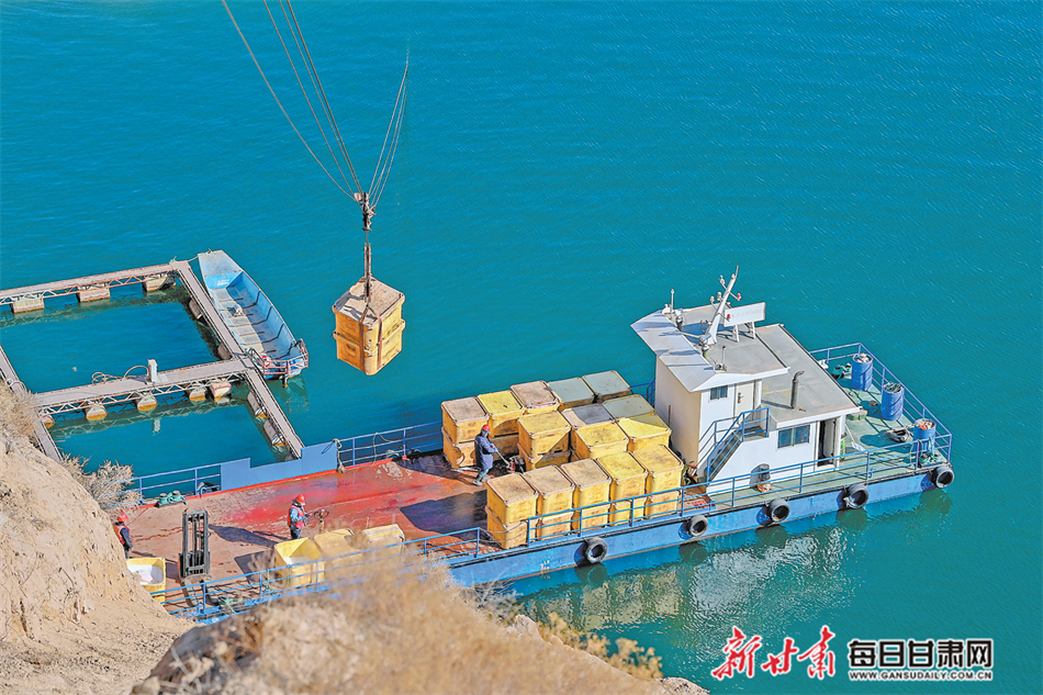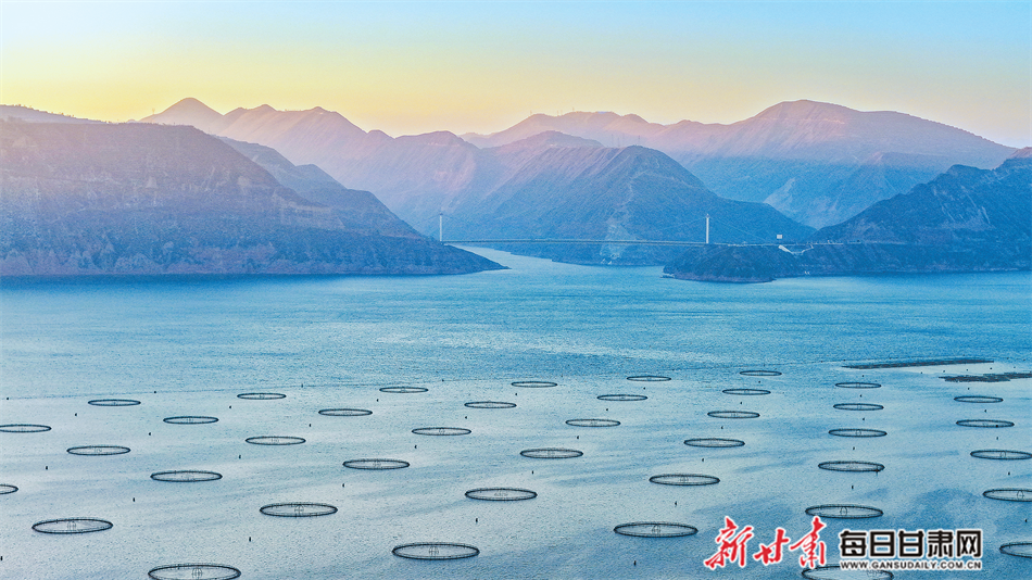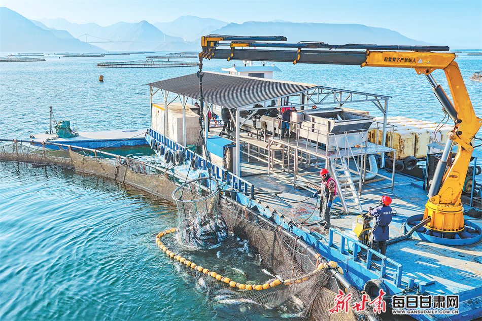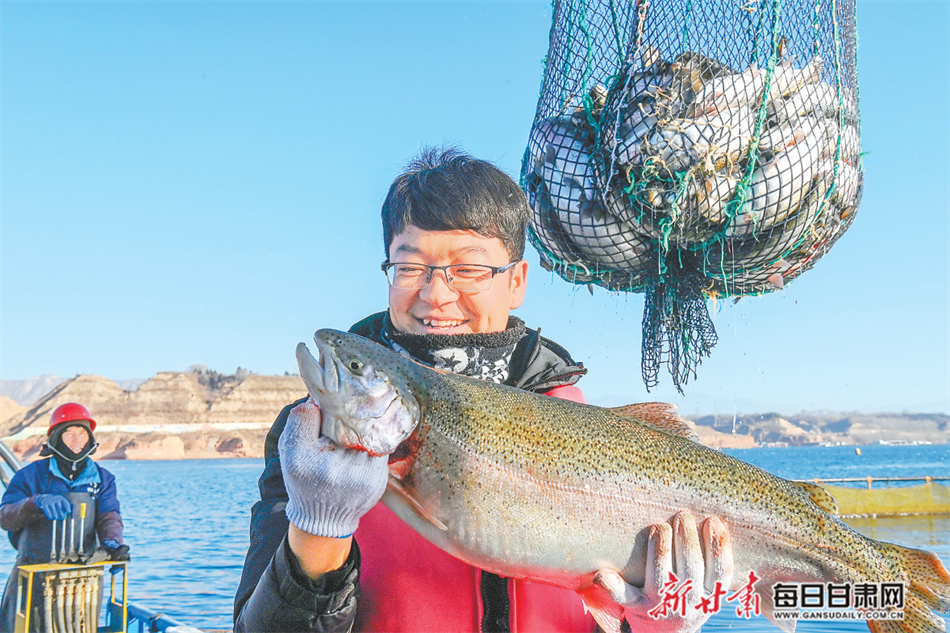 寒冬时节,刘家峡水库碧波荡漾,直径30多米的“大圈”网箱内,三文鱼长得肥美。随着渔网缓缓拉起,鱼儿跃出水面,定格成一幅鲜活的丰收图景。