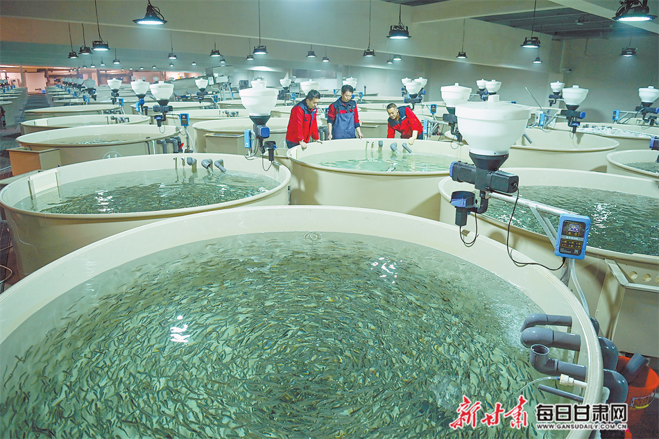 工人在永靖县陆基循环水智慧水产养殖产业园进行鱼苗种培育。