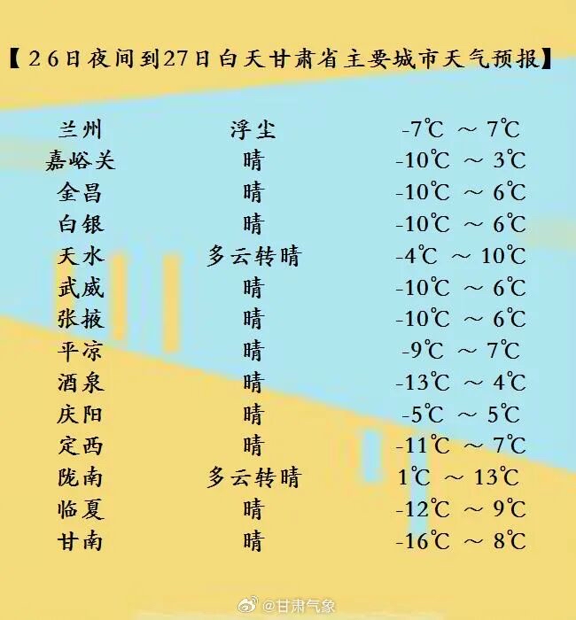 1月26日夜间到27日白天,全省各地晴或多云,甘南高原有4至5级偏西风。另外,白银、兰州两市部分地方及定西、天水、平凉、酒泉等市局部地方有浮尘。