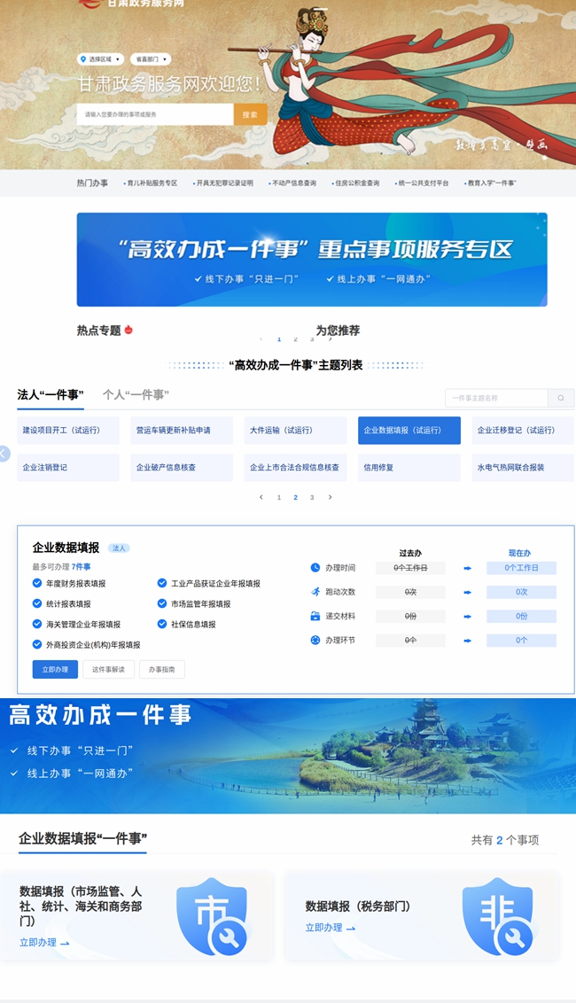 渠道一:申请人在浏览器输入网址https://zwfw.gansu.gov.cn,进入甘肃政务服务网官网,点击“高效办成一件事·企业数据填报”专题入口,找到“数据填报(市场监管、人社、统计、海关和商务部门)”模块,点击“立即办理”。