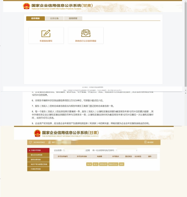 企业若办理有行政许可证的(例如危化品经营许可证,食品流通许可证等),在登录进入年报系统后,须点击“其他自行公示信息”,进入填写页面,点击“行政许可信息”,按照模板内容填写后点击保存,并点击“提交并公示”。