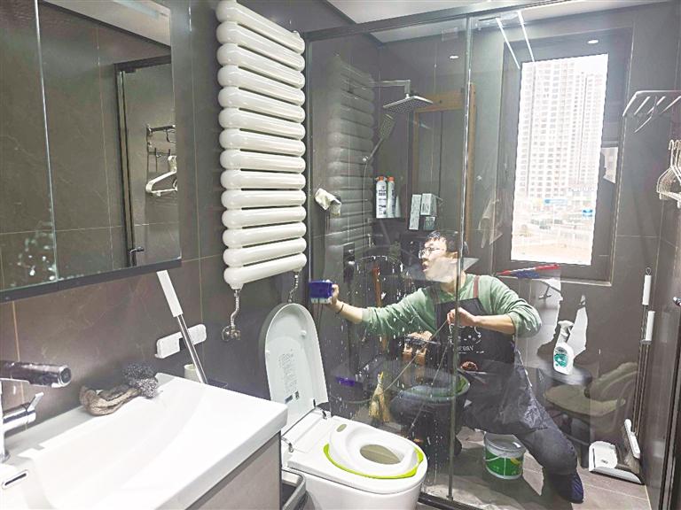 “00后”家政从业者小杨在擦洗淋浴间玻璃