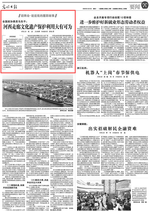 河西走廊是丝绸之路的重要通道,历史文化遗产极为丰富。“2025年,我先后4次深入河西走廊地区开展调研发现,虽然当地的文化遗产保护利用取得了一定成效,但在内涵挖掘、对外宣传、硬件建设等方面还存在短板和挑战。”马东平说,今年两会,她将紧扣数字赋能河西走廊文化遗产保护利用撰写提案,推动遗产保护从“抢救性修复”向“预防性保护”转型,文化传承从“静态展示”向“活态传播”升级,产业发展从“单一旅游”向“多元融合”跨越,实现文化价值、生态价值与经济价值的协同增效。