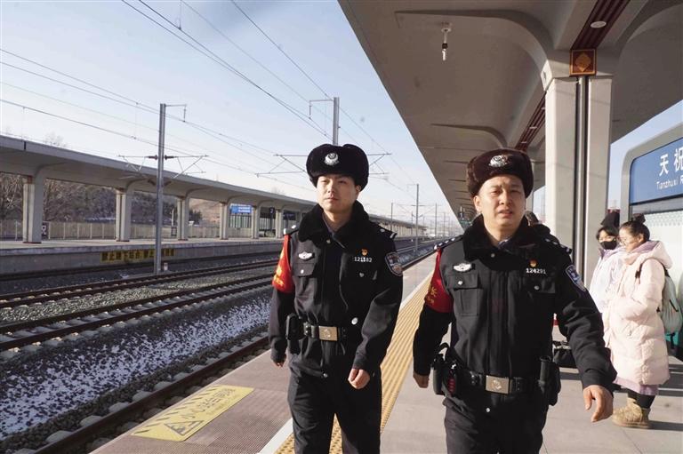 从警多年,王振早已习惯了节日里的坚守。车站里,他带领徒弟加大巡逻频次、提高见警率,耐心解答旅客疑问、解决急难愁盼,严把安检关口,杜绝危险品进站上车;线路上,联合铁路企业、地方护路队,采取“重点时段联合巡、其他时段交叉巡”的方式,织密安全防护网,确保铁路行车零隐患。高原的寒风磨糙了他的脸颊,却磨不灭他眼中的坚毅,“一列火车上千人,任何微小失误都可能造成无法挽回的损失,守好阵地,是我们的职责。”